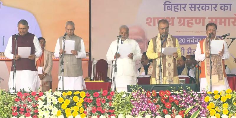 बिहार | बिहार विधानसभा में बहुमत हासिल करने के बाद गुरुवार को पटना के गांधी मैदान में नीतीश कुमार 10वीं बार मुख्यमंत्री पद की शपथ ली. नीतीश कुमार के साथ सहयोगी दल भारतीय जनता पार्टी, जनता दल यूनाइडेट, लोजपा (रामविलास), हम और रालोमो से कुल 26 एमएलए ने भी मंत्री पद की शपथ ली. नीतीश सरकार के नए कैबिनेट में पुरानी सरकार के 19 मंत्रियों की छुट्टी हो गई जबकि 12 नए मंत्रियों ने एंट्री ले ली है.
