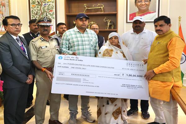 मऊगंज. मुख्यमंत्री डॉ. मोहन यादव ने गुरूवार को मुख्यमंत्री निवास पर मऊगंज जिले के गौतम परिवार को व्यक्तिगत दुर्घटना बीमा के अंतर्गत एक करोड़ रूपये की राशि का चेक प्रदान किया। भारतीय स्टेट बैंक की पुलिस सेलरी पैकेज योजना में पुलिसकर्मियों को दी जाने वाली पूरक व्यक्तिगत दुर्घटना बीमा सुविधा के अनुसार परिवार को यह राशि प्रदान की गई। मुख्यमंत्री डॉ. यादव ने शहीद गौतम के पात्र उत्तराधिकारी को शासकीय सेवा में लेने के निर्देश पुलिस महानिदेशक को दिए हैं।