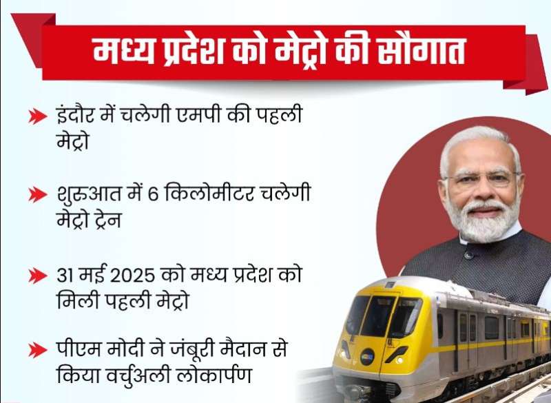 - मध्यप्रदेश को मिली पहली मेट्रो रेल सेवा. प्रधानमंत्री ने 1 हजार 520 करोड की लागत से तैयार मेट्रो ट्रेन का शुभारंभ किया. प्रधानमंत्री ने रिमोट का बटन दबाकर मेट्रो की सौगात दी.