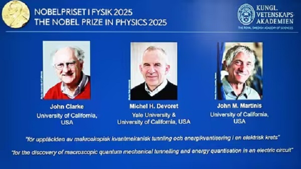 नई दिल्ली । भौतिकी (Physics) में नोबेल पुरस्कार 2025 (Nobel Prize 2025) के विजेताओं (Winners) का ऐलान कर दिया गया है। इस वर्ष जॉन क्लार्क, माइकल एच डेवोरेट और जॉन एम मार्टिनिस को क्वांटम मेकेनिक्स टनलिंग में काम करने के लिए भौतिकी के नोबेल पुरस्कार (Nobel Prize) से सम्मानित किया जाएगा। इन तीनों शख्सियतों को 10 दिसंबर को आयोजित समारोह में यह पुरस्कार प्रदान किया जाएगा।