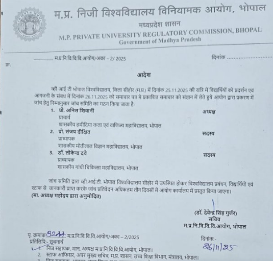 मध्य प्रदेश निजी विश्वविद्यालय विनियामक आयोग, भोपाल द्वारा गठित जांच समिति में 3 सदस्य हैं. इसमें शासकीय हमीदिया कला एवं वाणिज्य कॉलेज के प्राचार्य प्रोफेसर अनिल शिवानी (अध्यक्ष), शासकीय मोतीलाल विज्ञान कॉलेज के प्राध्यापक प्रोफेसर संजय दीक्षित (सदस्य) और शासकीय गांधी चिकित्सा कॉलेज के प्राध्यापक डॉक्टर डॉ. लोकेंद्र दवे (सदस्य) हैं।